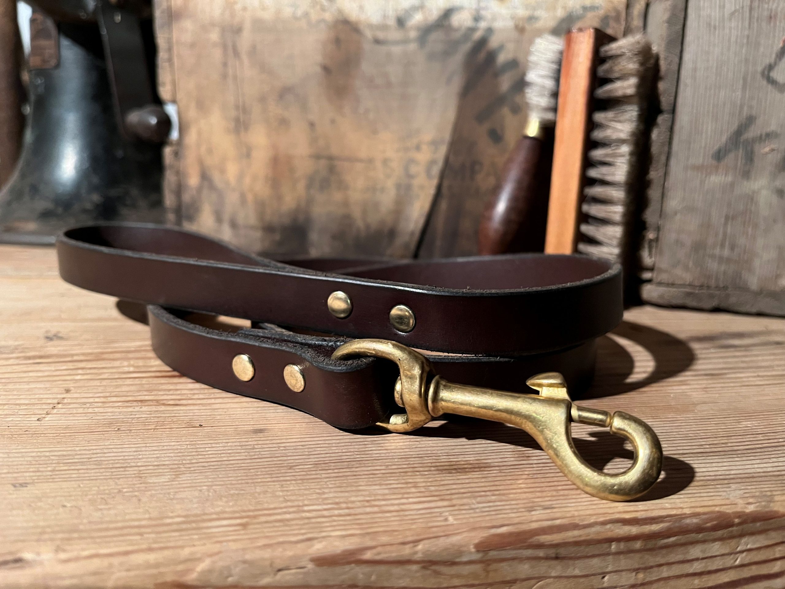 – Brown leather with brass fittings